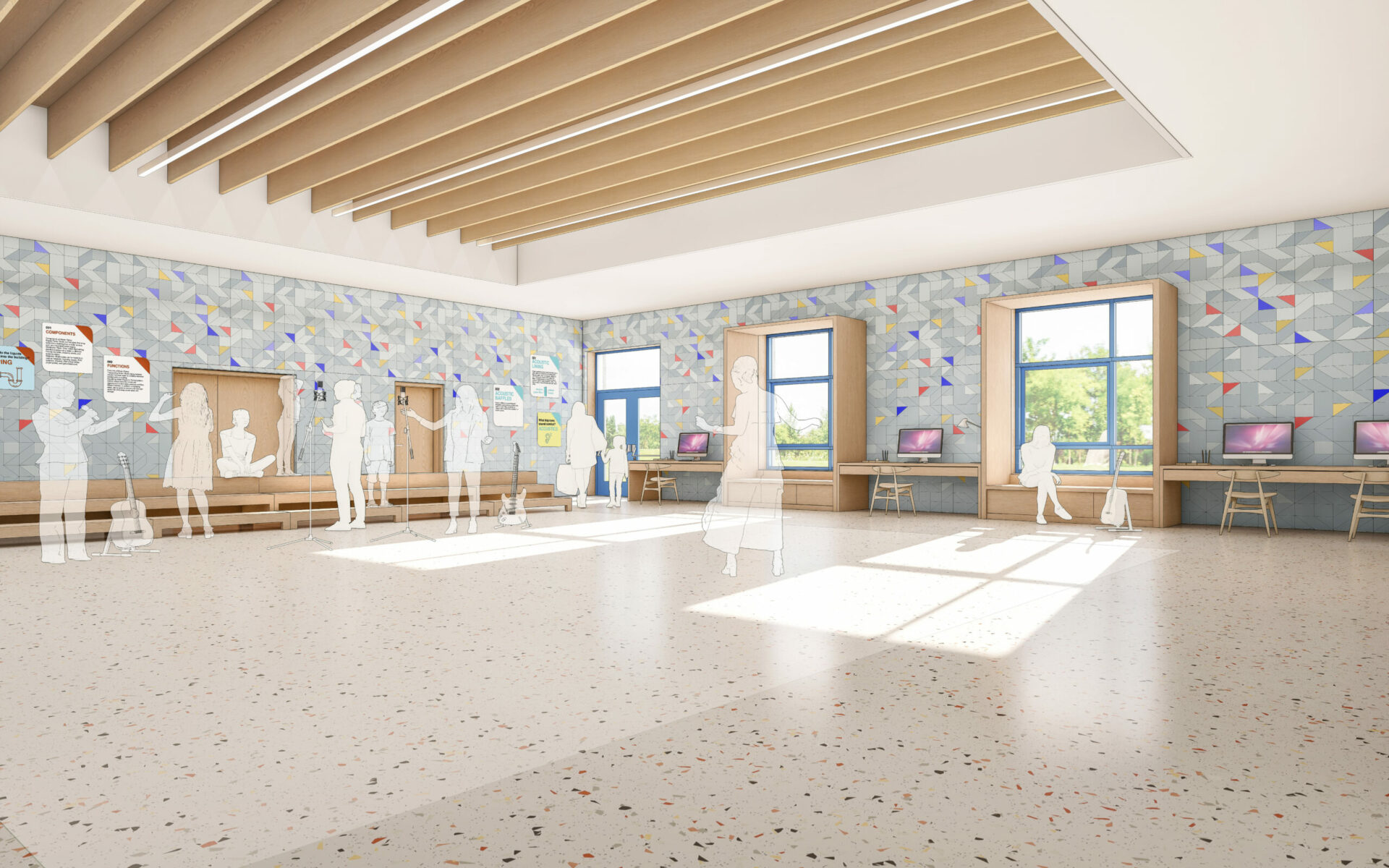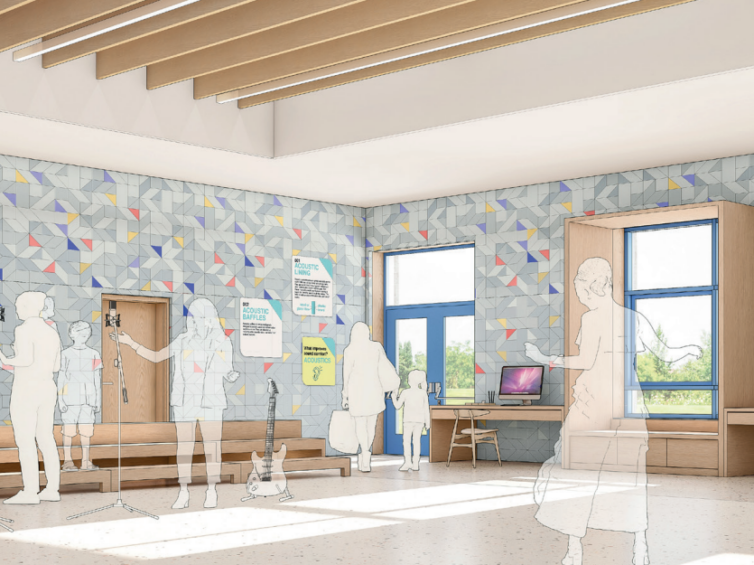 Pour la salle de musique : un volume creusé au plafond, rythmé par des baffles acoustiques longitudinaux qui laissent entrevoir les installations techniques. Entre ces baffles, des luminaires suspendus diffusent un éclairage général homogène et confortable visuellement. Aux murs, des lambris acoustiques micro perforés se parent de motifs inspirés de l’origami, tandis que des touches de couleur semblent flotter dans l’air comme des notes suspendues, en écho au rythme régulier créé par le plafond. Le mobilier intégré, en finition chêne, contribue à créer une atmosphère douce et chaleureuse.