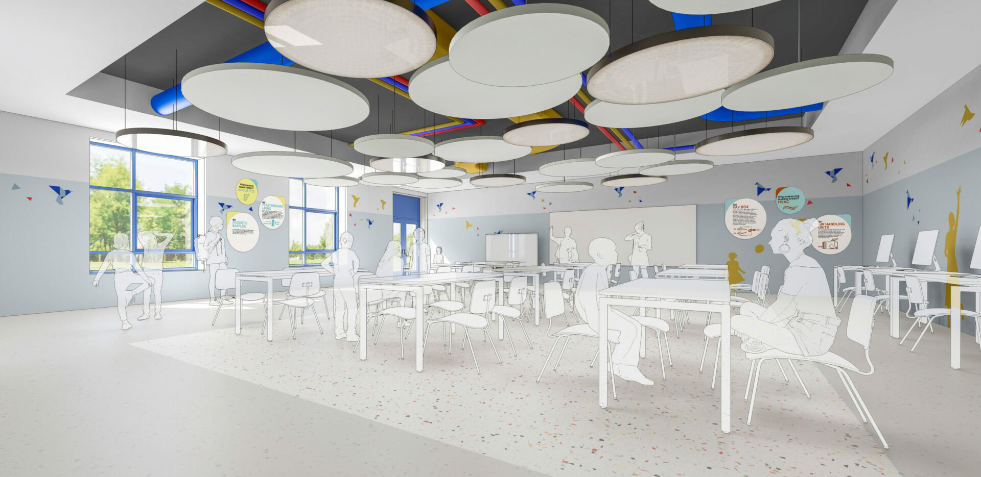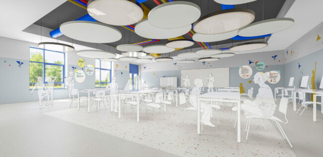 Pour la salle d’arts plastiques, le design reste volontairement épuré au sol et sur les murs, mais s’exprime pleinement au plafond : un volume creusé, marqué d’une teinte sombre, traversé par des conduits colorés. Chaque conduit, associé à une couleur, est accompagné de panneaux indiquant ce qu’il transporte (air, eau, électricité, etc.), transformant ainsi les installations techniques en éléments pédagogiques et ludiques.