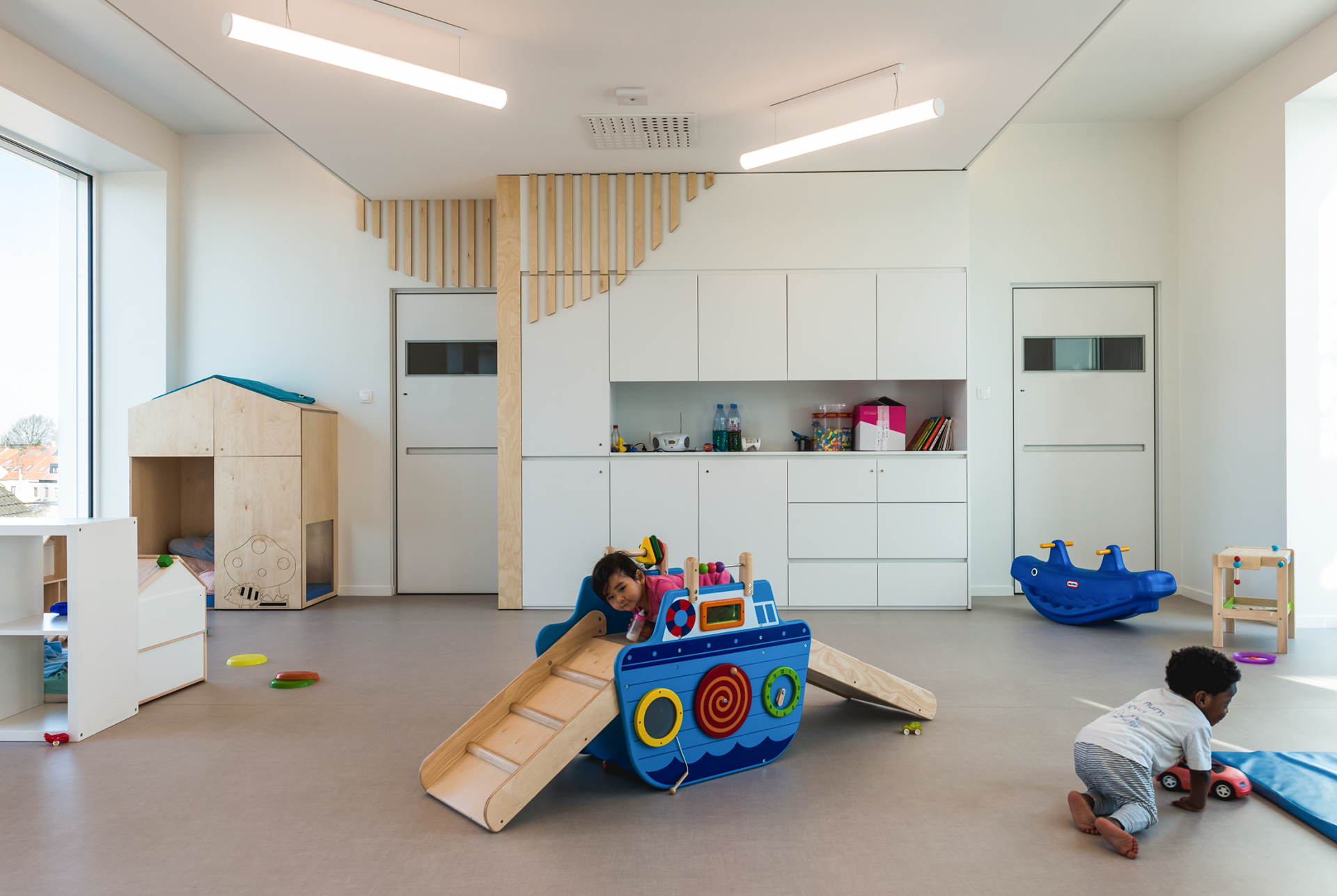Le rez-de-chaussée, les premier et deuxième étages sont équipés d’installations pouvant accueillir un total de 54 enfants. Une attention particulière a été portée au lien entre les niveaux : à la fois physiquement, avec des escaliers et un ascenseur, et visuellement, en créant un vide dans la cage d’escalier. Les escaliers sont finis avec des barres d’acier émaillées blanches allant de bas en haut, pour souligner la verticalité.