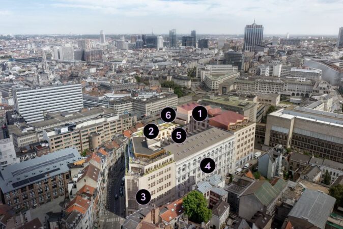 1. ‘Justice’ : bureaux 2. ‘Lebeau’ : résidentiel 3. ‘Sablon’ : bureaux 4. ‘Paille’ : bureaux 5. ‘The Parc’ : jardin partagé 6. Parking