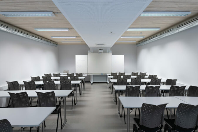La libre ouverture de la piscine est maintenue et est brisée avec esthétisme par des passerelles placées ponctuellement pour accéder aux espaces voisins. Naturellement, les installations techniques de cette université unique sont remises au goût du jour, de sorte que celle-ci puisse accueillir ses étudiants avec des équipements de pointe (projection assistée, maitrise acoustique, imageries visuelles…) ainsi qu’un équipement qui répond aux dernières normes en matière de sécurité.