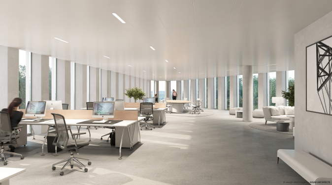 Par ailleurs, la nature portante des façades, associée à leur modulation particulière, libère de grandes surfaces intérieures propices à une organisation très souple des espaces de travail. Structuré sur 6 niveaux (rez + 4/-1) l’immeuble développe une superficie utile de 4.780 m². Ces derniers sont organisés et loués selon des modules variant de 370 à 1.050 m². On y trouve à tous les étages, des espaces flexibles permettant l’aménagement de bureaux open-space, de bureaux cloisonnés, de salles de réunions, de kitchenettes et de coins détente.