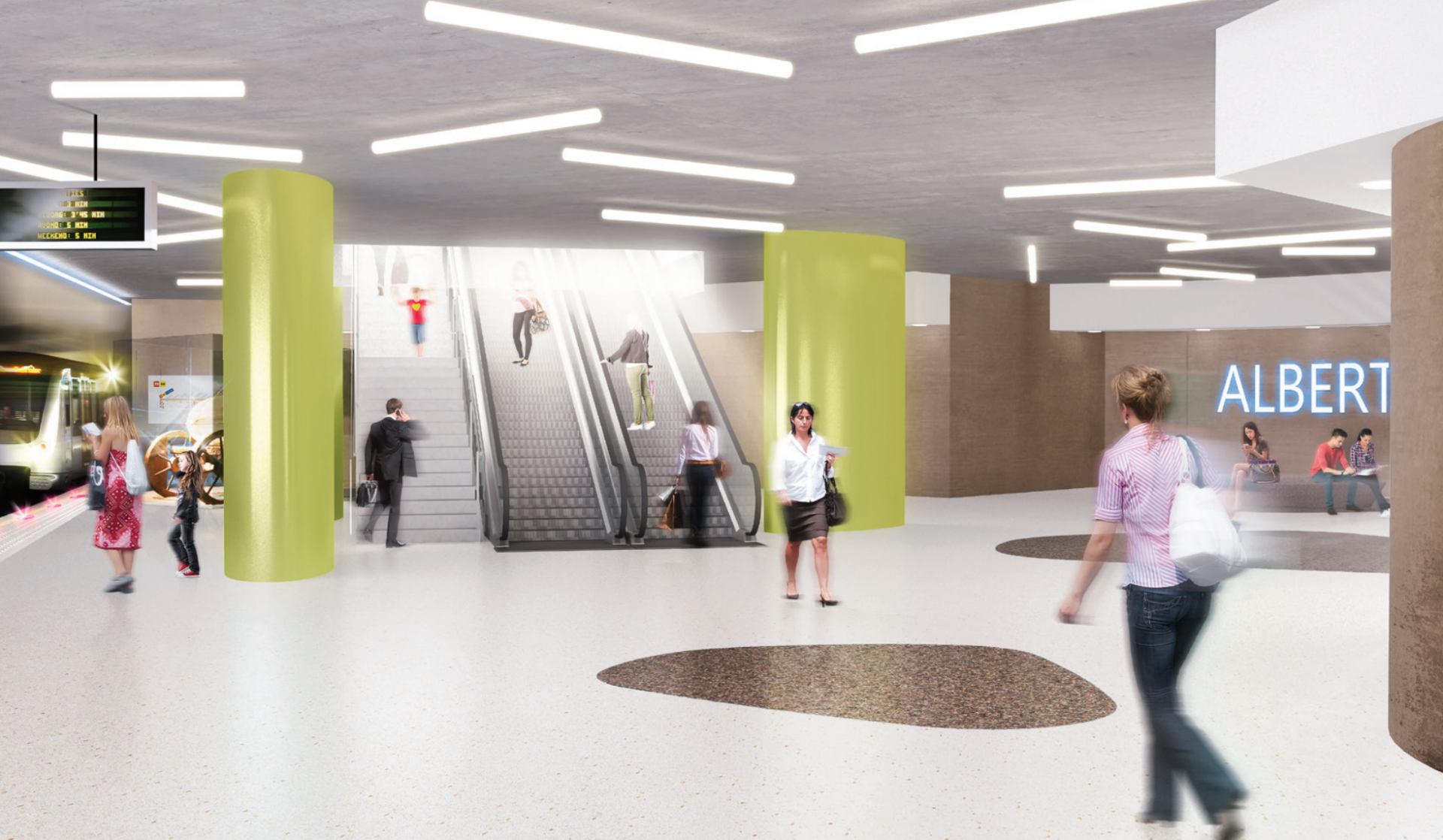 La nouvelle configuration de la station Albert à usage mixte (tram-métro) entraînera une intensification et une complexité accrue des flux de voyageurs. L’objectif du projet architectural est de garantir la fluidité de ces flux en créant un sentiment de sécurité et en donnant à la station une identité propre. Des espaces de rencontre et de convivialité contribueront à cet objectif, tout comme l’ouverture des zones d’accès, de circulation et d’attente. Les cheminements entre les quais et les zones supérieures seront clarifiés grâce à la réduction des nuisances sonores, à la transparence et à l’utilisation de la couleur, à l’installation de commerces de qualité, à la mise en place d’un parking vélo sécurisé et, enfin, à l’emploi de matériaux de finition durables.